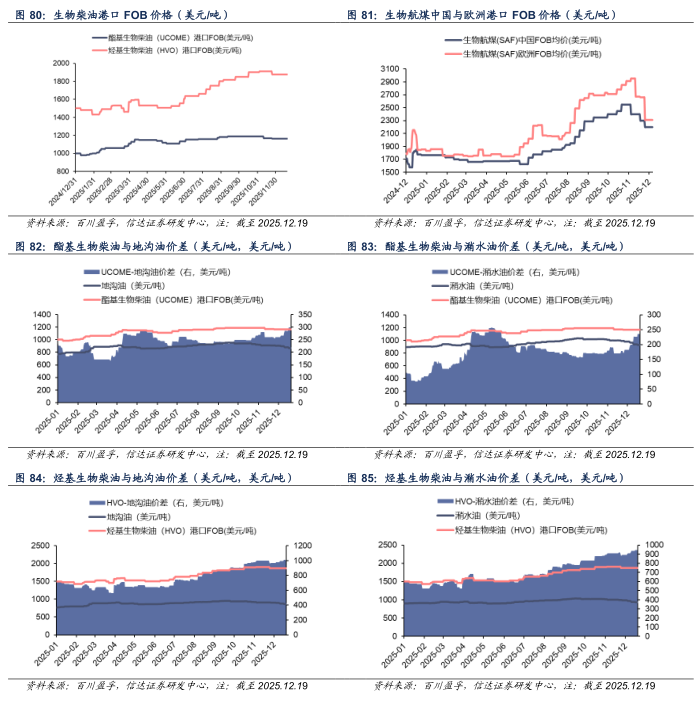 【生物燃料价格】截至2025年12月19日,酯基生物柴油港口FOB价格为1165美元/吨,较上周五价格持平,与地沟油、潲水油价差分别为297.53、235.16美元/吨,较上周五价差分别+13.08、+9.18美元/吨。烃基生物柴油港口FOB价格为1875美元/吨,较上周五价格持平,与地沟油、潲水油价差分别为1007.53、945.16美元/吨,较上周五价差分别+13.08、+9.18美元/吨。截至2025年12月19日,中国生物航煤港口FOB价格为2200美元/吨,较上周五价格-100美元/吨,与地沟油、潲水油价差分别为1332.53、1270.16美元/吨,较上周五价差分别+13.08、+9.18美元/吨。欧洲生物航煤港口FOB价格为2310美元/吨,较上周五价格持平。截至2025年12月19日,中国地沟油、潲水油价格分别为867.47、929.84美元/吨,较上周五价格分别-13.08、-9.18美元/吨,中国餐厨废油UCO价格为1045美元/吨,较上周五价格持平。