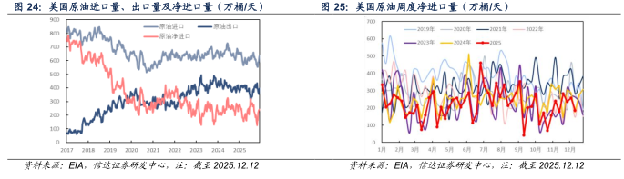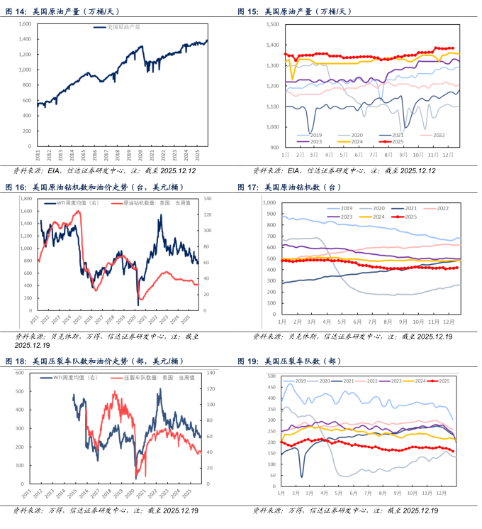 【美国原油供给】截至2025年12月12日当周,美国原油产量为1384.3万桶/天,较上周减少1.0万桶/天。截至2025年12月19日当周,美国活跃钻机数量为406台,较上周减少8台。截至2025年12月19日当周,美国压裂车队数量为160部,较上周减少8部。