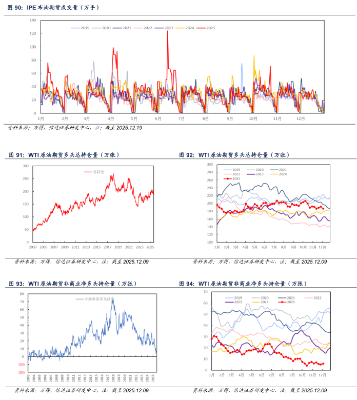 原油期货成交及持仓:截至2025年12月19日,周内布伦特原油期货成交量为204.82万手,较上周增加10.41万手(+5.36%)。截止至2025年12月09日,周内WTI原油期货多头总持仓量为186.8万张,较上周减少4.67万张(-2.44%);非商业(投机和套利目的持有)净多头持仓5.84万张,较上周增加0.74万张(+14.49%)。
