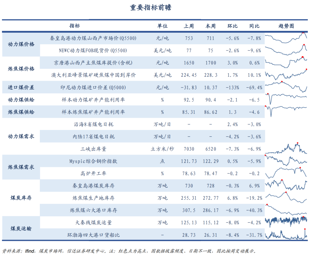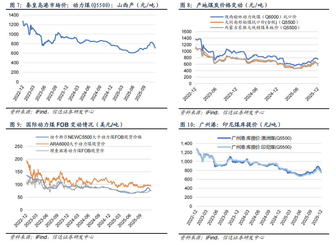 我们认为,当前正处在煤炭经济新一轮周期上行的初期,基本面、政策面共振,现阶段逢低配置煤炭板块正当时。本周基本面变化:供给方面,本周样本动力煤矿井产能利用率为90.4%(-2.1个百分点),样本炼焦煤矿井产能利用率为86.62%(+1.31个百分点)。需求方面,内陆17省日耗周环比下降16.60万吨/日(-4.23%),沿海8省日耗周环比上升4.70万吨/日(+2.35%)。非电需求方面,化工耗煤周环比上升2.58万吨/日(+0.35%);钢铁高炉开工率为78.47%(-0.16个百分点);水泥熟料产能利用率为37.65%(-1.34个百分点)。价格方面,本周秦港Q5500煤价收报711元/吨(-42元/吨);京唐港主焦煤价格收报1700元/吨(+50元/吨)。值得注意的是,受气温偏暖和港口库存持续积累影响,当前煤炭市场依然延续弱势格局,煤炭价格承压下行。自11月21日以来,秦皇岛港口5500卡煤炭价格已下行超100元/吨,价格跌幅及下降速度均较大。我们认为,煤炭行业供给管控底层逻辑仍然未变,且随着煤价下跌底层逻辑对市场支撑力度趋强,尽管短期供需宽松态势延续,市场仍处于探底过程,但煤炭价格底部或已临近。煤炭配置核心观点:当下,我们信达能源团队一直提出的煤炭产能短缺的底层投资逻辑未变(短期供需基本平衡,中长期仍存缺口)、煤价底部确立并中枢站上新平台的趋势未变、优质煤企高盈利&高现金流&高ROE&高分红的核心资产属性未变(ROE为10-15%,股息率>5%,新增中期分红)、以及煤炭资产相对低估且估值整体性仍有望提升的判断未变(一级矿权市场高溢价,多数公司PB约1倍),且公募基金煤炭持仓处于低配状态。基于此,煤炭板块配置策略不可忽视红利特性,又要把握顺周期弹性。即,煤炭板块向下回调有高股息边际支撑,向上弹性有后续煤价上涨预期催化,叠加伴随煤价底部确认有望带来估值重塑且具有较大提升空间,煤炭资产仍是具有性价比、高胜率和高赔率资产。当前,煤炭板块迎来较大回调,再次出现较高性价比的底部机会,反观煤炭企业不断实施增持、回购彰显发展信心。我们继续坚定看多煤炭,再度提示逢低配置。总体上,能源大通胀背景下,我们认为未来3-5年煤炭供需偏紧的格局仍未改变,优质煤炭企业依然具有高壁垒、高现金、高分红、高股息的属性,叠加煤价筑底推动板块估值重塑,板块投资攻守兼备且具有高性价比,短期板块回调后已凸显出较高的投资价值,再度建议重点关注现阶段煤炭的配置机遇。