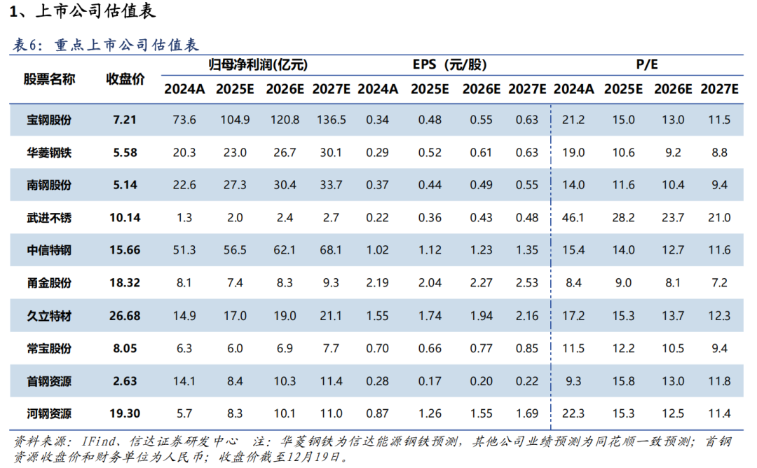 本周,截至12月19日,日均铁水产量为226.55万吨,周环比下降2.65万吨,同比下降5.92万吨。五大钢材品种社会库存周环比下降3.74%,五大钢材品种厂内库存周环比下降0.53%。本周,日照港澳洲粉矿(62%Fe)上涨13.0元/吨 ,京唐港主焦煤库提价上涨50.0元/吨。需注意的是,12月13日,2025-2026中国经济年会召开,主题为“贯彻落实中央经济工作会议精神,以高质量发展为‘十五五’开好局”。中央财办分管日常工作的副主任、中央农办主任韩文秀,国家发展改革委副秘书长肖渭明,中国国际经济交流中心副理事长王一鸣发表演讲。要以“双碳”为引领,加快推进全面绿色转型,实现碳排放总量和强度双控制度。从明年开始,有力有效管控高耗能高排放项目,加快落后产能淘汰和绿色低碳技术装备创新应用,完善资源总量管理和全面节约制度,加快化石能源清洁高效利用。我们认为,在海外关税影响下,出口占比较低的普钢公司受影响较小,叠加国家“稳增长”政策下,房地产、基建等行业用钢需求有望边际改善。当前,普钢吨钢利润可观,在行业“反内卷”背景下,普钢公司业绩改善空间较大,有望迎来价值修复,钢铁板块亦有望迎来配置良机。