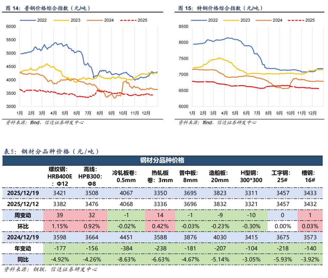钢材价格&利润。截至12月19日,普钢综合指数3448.7元/吨,周环比增加14.76元/吨,周环比增加0.43%,同比下降6.13%。截至12月19日,特钢综合指数6569.9元/吨,周环比增加4.32元/吨,周环比增加0.07%,同比下降3.32%。截至12月19日,螺纹钢高炉吨钢利润为42元/吨,周环比增加21.0元/吨,周环比增加100.00%。截至12月19日,建筑用钢电炉平电吨钢利润为-7元/吨,周环比增加18.0元/吨,周环比增加72.00%。