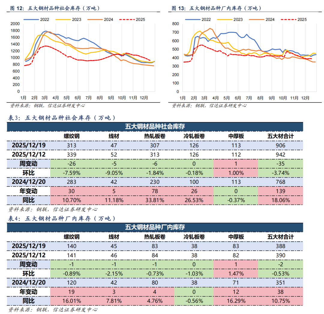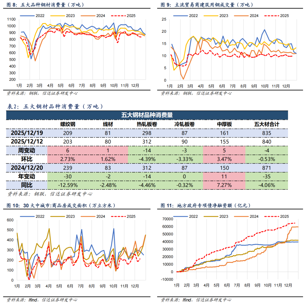 ⚫ 五大钢材品种消费量:截至12月19日,五大钢材品种消费量835.3万吨,周环比下降4.44万吨,周环比下降0.53%。