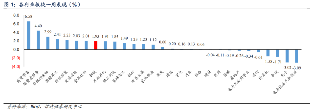 本周钢铁板块上涨1.93%,表现优于大盘;本周沪深300下跌0.28%到4568.18;涨跌幅前三的行业分别是商贸零售(6.58%)、消费者服务(4.40%)、非银行金融(2.99%)。