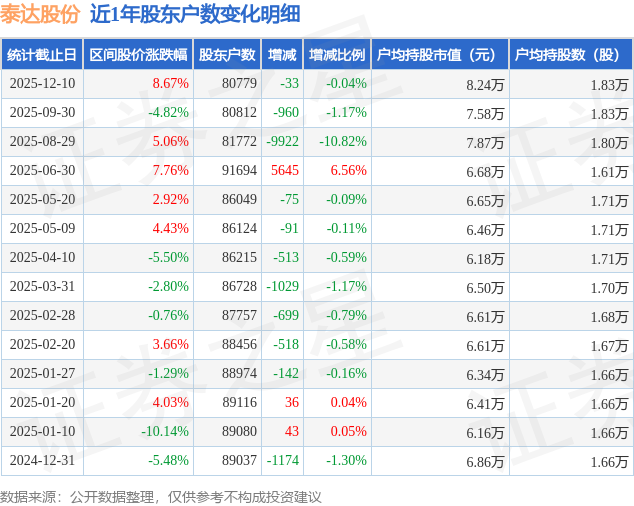 从股价来看,2025年9月30日至2025年12月10日,泰达股份区间涨幅为8.67%,在此期间股东户数减少33.0户,减幅为0.04%。