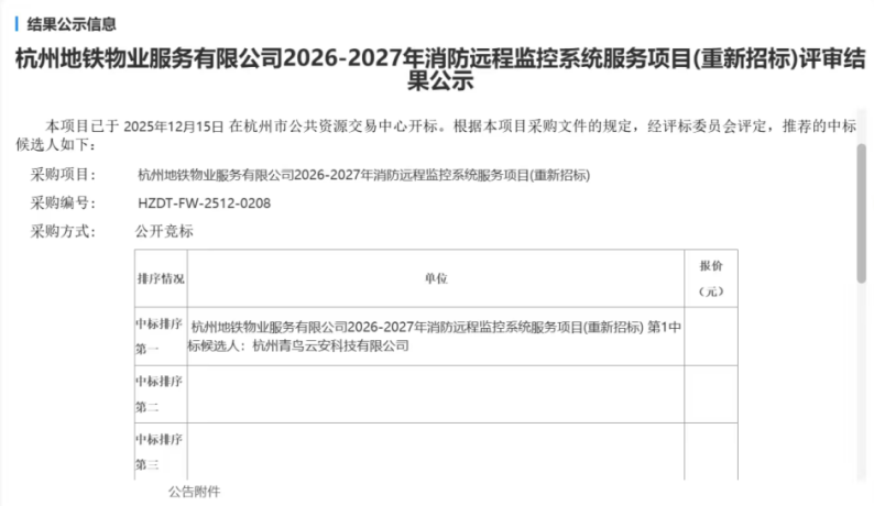 近日,青鸟杭州远程值守中心(杭州青鸟云安科技有限公司)凭借青鸟消防云平台的深厚技术积淀与远程值守服务的实战经验,成功中标杭州地铁物业服务有限公司(以下简称“杭州地铁”)2026-2027年度消防远程监控系统服务项目。此次中标,不仅标志着青鸟远程值守服务在国内轨道交通智慧消防领域实现关键性突破,更为公司深度参与轨道交通安全体系建设、拓展智慧消防核心应用场景筑牢了坚实根基。