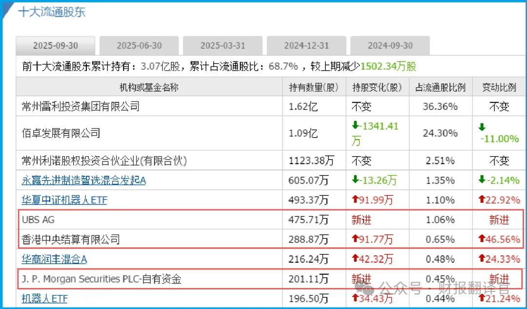 J.P. Morgan Securities PLC(摩根大通)的自有资金账户首次进入前十大股东;UBS AG(瑞银集团)同样位列其中。