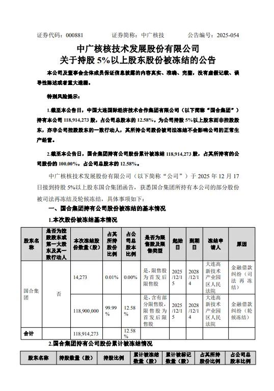 12月19日,中广核技(000881)公告称,公司于2025年12月17日接到持股5%以上股东中国大连国际经济技术合作集团有限公司(简称“国合集团”)函告,获悉国合集团所持有本公司的部分股份被司法再冻结及轮候冻结。
