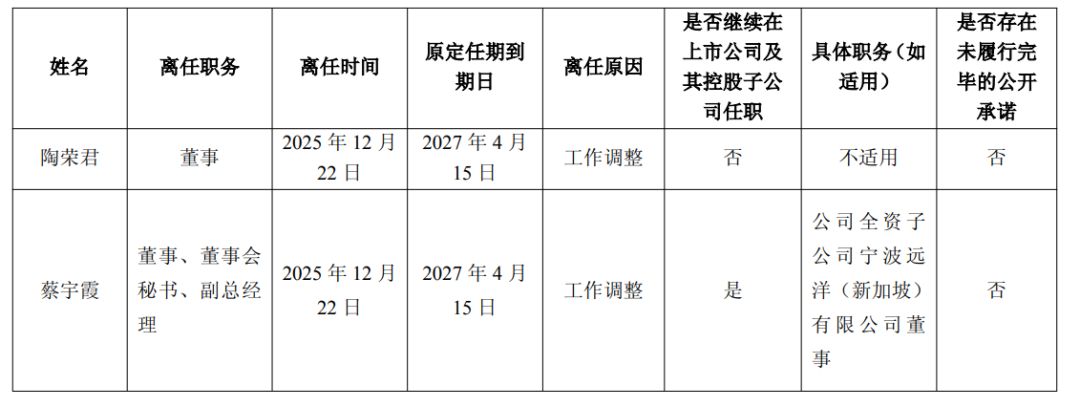公告显示,因工作调整,陶荣君先生申请辞去公司董事职务,辞职后将不在公司及其控股子公司担任任何职务。蔡宇霞女士申请辞去公司董事、董事会秘书、副总经理职务,辞职后将不在公司担任任何职务,但仍将继续担任公司全资子公司宁波远洋(新加坡)有限公司董事职务。