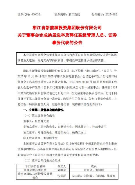 浙江新能(600032)公告称,公司于2025年12月19日召开2025年第六次临时股东会,会议选举产生了公司第三届董事会5名非独立董事、3名独立董事,并与2025年12月18日召开的职工代表大会选举产生的1名职工代表董事共同组成公司新一届董事会,任期自2025年第六次临时股东会审议通过之日起三年。