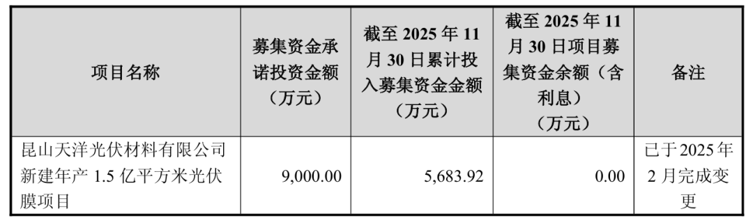 截至2025年11月30日,昆山天洋光伏材料有限公司新建年产1.5亿平方米光伏膜项目、南通天洋光伏材料科技有限公司太阳能封装胶膜项目、海安天洋新材料科技有限公司新建年产1.5亿平方米光伏膜项目投入募集资金金额分别为5683.92万元、2.49亿元、9399.82万元,合计投入募资金额约4亿元。