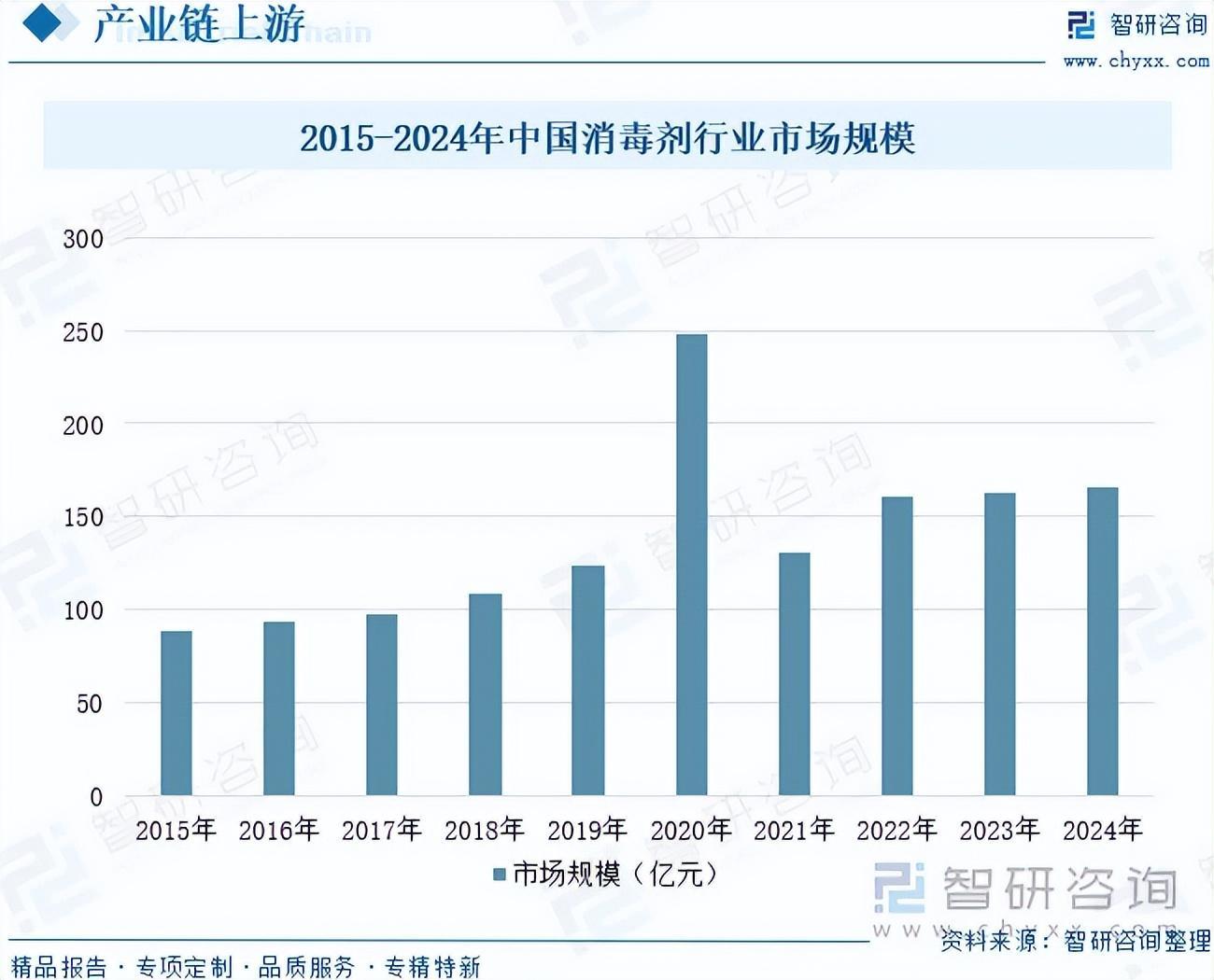 消毒剂作为水环境修复的关键药剂之一,主要用于杀灭水体中的病原微生物,抑制藻类过度繁殖,保障水生态健康与用水安全。受益于市场需求的持续推动,我国消毒剂行业近年来实现显著发展,整体规模快速增长。尤其在2020至2022年期间,受新冠疫情影响,公众与机构对消毒的重视程度空前提升,推动市场规模迅速扩大,2020年行业规模达247.65亿元,同比增幅高达99.78%,至2022年规模为160.47亿元。尽管2023年起疫情影响逐步减弱,市场规模出现阶段性回调,但随着居民日常消毒习惯的养成,消毒产品已逐渐成为生活中常用品,使用频率稳步增加。同时,医疗机构、公共场所等为应对常态化防控需求,持续开展大范围、高频次的消毒作业,为行业带来持续稳定的市场空间。在此背景下,2024年中国消毒剂行业市场规模已恢复至165.3亿元,预计未来将在民生与专业需求共同驱动下保持稳健增长态势。