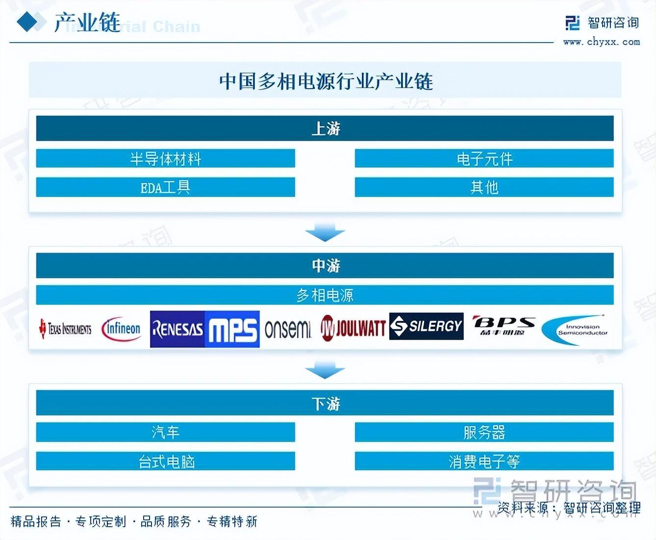 多相电源行业上游主要包括半导体材料、电子元件、EDA工具等行业;行业中游为多相电源设计、制造、封装、测试等环节;行业下游为应用市场,多相电源凭借低纹波、高瞬态、高功率密度与低热耗,已成为汽车、服务器、台式电脑、通信、消费电子等领域的主流供电方案,尤其适配低电压大电流的核心芯片与高可靠供电场景。