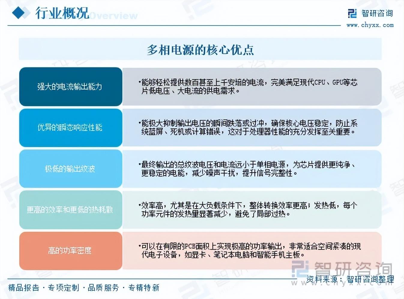 多相电源具有强大的电流输出能力、优异的瞬态响应性能、极低的输出纹波、更高的效率、更低的热耗散、高的功率密度,是现代高性能计算芯片供电的核心技术,已广泛应用于服务器、台式电脑、显卡、通信设备、汽车电子及高端消费电子等领域中,为CPU、GPU、FPGA等核心芯片供电的绝对主流和最优解决方案。