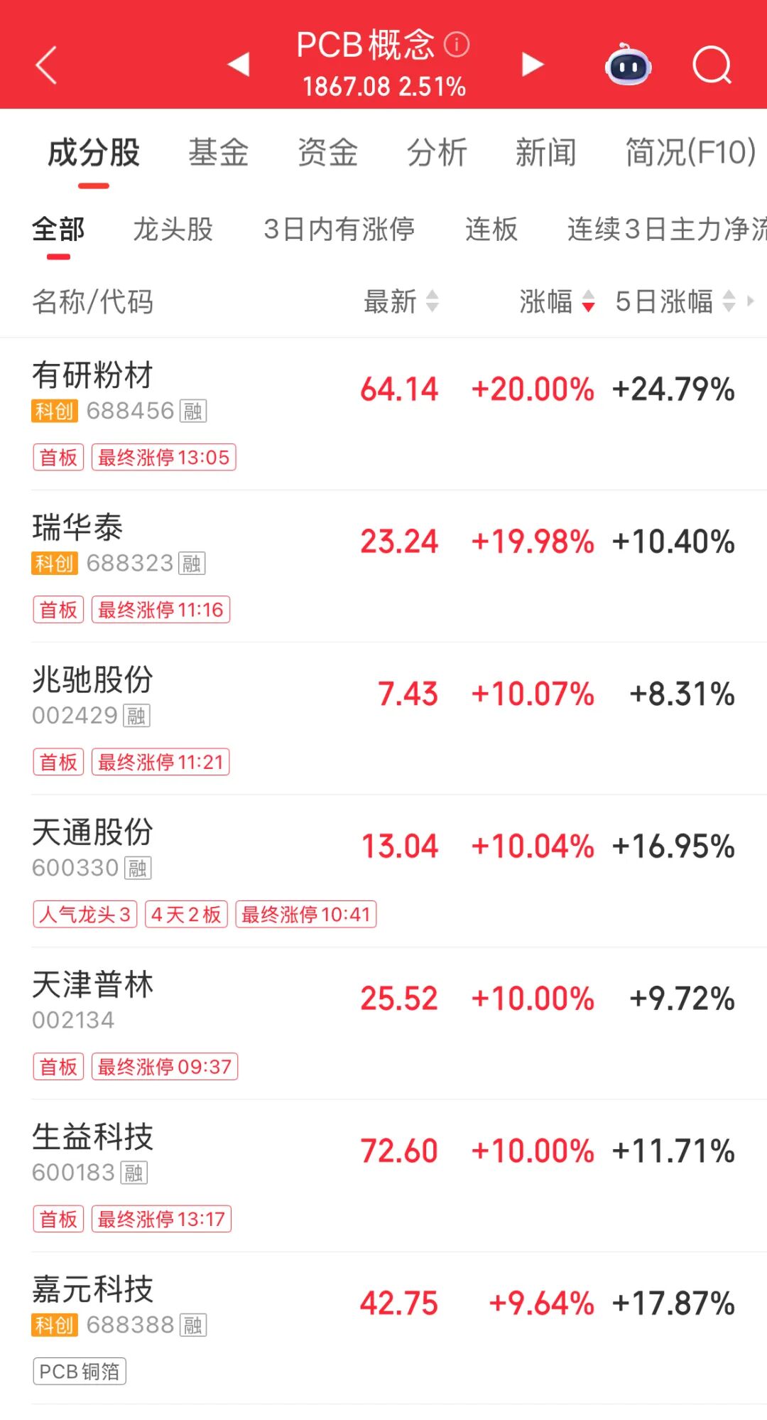 pcb概念24日午后异动拉升,生益科技(600183)快速拉升涨停,股价创历史新高,截至发稿报72.6元/股,最新总市值1764亿元。有研粉材(688456)午后“20cm”涨停。南亚新材、景旺电子、华正新材、生益电子等跟涨。