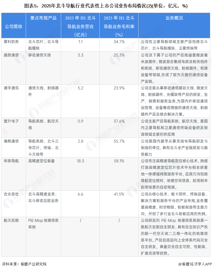 2025年上半年,中国北斗导航行业中,华测导航、合众思壮、通宇通讯北斗相关业务营收达到5亿元以上,领先于其他上市公司;从毛利率水平看,臻镭科技、*ST铖昌、海格通信、华测导航、振芯科技等企业毛利率水平超过50%,高于其他上市公司;从重点产品布局看,布局导航芯片、导航系统的企业较多。