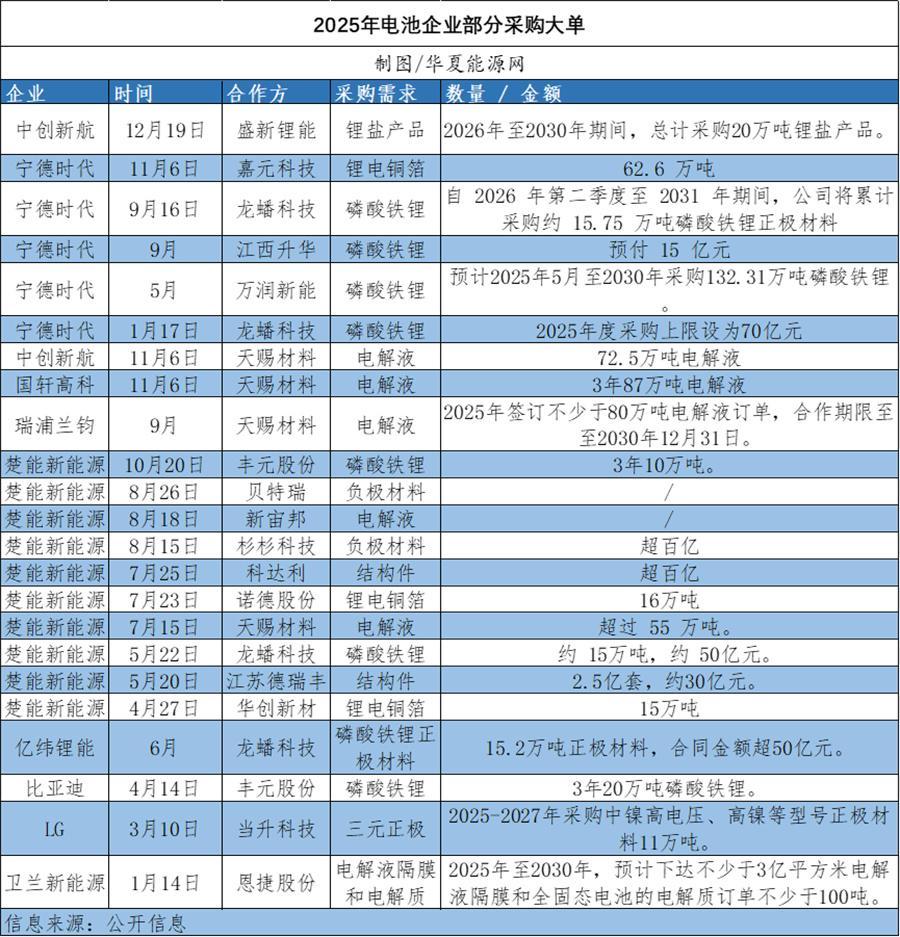 华夏能源网注意到,今年以来锂电产业链大单呈爆发状态,其他锂电池巨头如亿纬锂能(维权)(SZ:300014)、国轩高科(SZ:002074)、中创新航(HK:03931)等也相继披露了大额采购协议,涵盖磷酸铁锂、正负极材料、电解液、铜箔、隔膜等关键环节,这些订单动辄数十亿甚至数百亿元,协议期限多为3至5年。