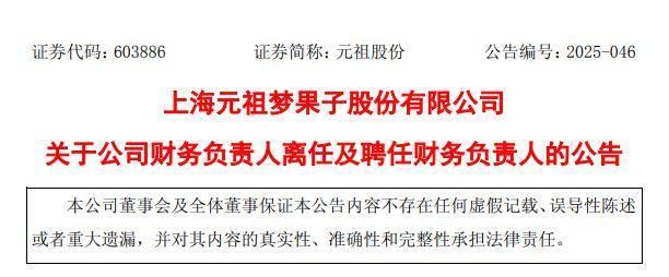 近日,元祖股份(603886.SH)发布公告称,财务负责人刘政因个人原因申请辞去公司财务负责人职务。