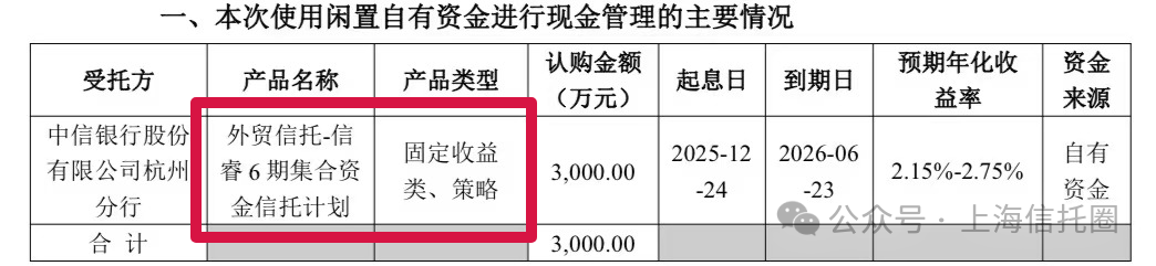 正强股份近日公告,使用3000万元闲置自有资金认购外贸信托-信睿6期集合资金信托计划,该产品为固定收益类,预期年化收益率2.15%-2.75%,期限半年,而公司前十二个月内累计未到期现金管理金额未超董事会批准额度,操作稳健合规。