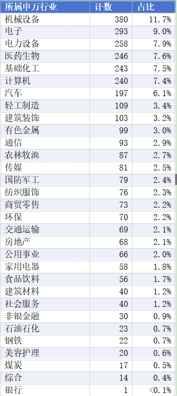 根据同花顺数据,机械设备、电子、电力设备、医药生物、基础化工、计算机、汽车、轻工制造、建筑装饰行业的上榜企业数量超过了100个,分别为380个、293个、258个、246个、243个、240个、197个、109个、103个。