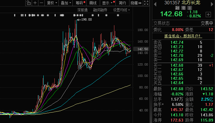 从行情走势来看,今年6月中旬,北方长龙股价开始猛涨,高点时每股达198元。截至目前,累计涨幅达301.94%。
