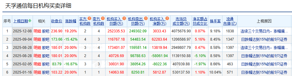 龙虎榜信息显示,天孚通信6次上榜多因 “连续三日涨幅偏离值达30%”“日涨跌幅达15%” 等强波动触发,说明资金集中发力于关键行情节点,非日常短线高频炒作。