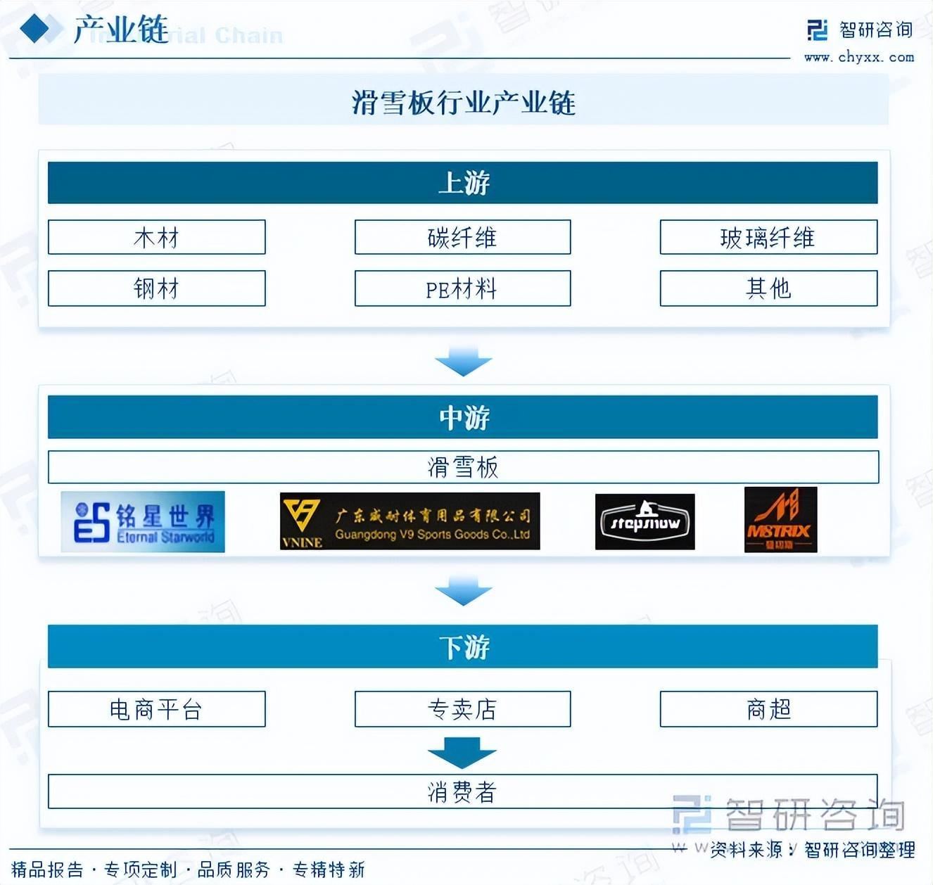 从产业链来看,滑雪板行业上游原材料包括木材、碳纤维、玻璃纤维、钢材、PE材料等,这些原材料的质量和性能直接影响到滑雪板的品质和性能。中游是指滑雪板的生产制造,该环节的企业需要根据市场需求和消费者偏好进行产品研发和设计,并选择合适的原材料进行生产。下游是指销售渠道,通过线上电商平台、线下专卖店、商超等渠道,最终将产品销售给终端消费者。