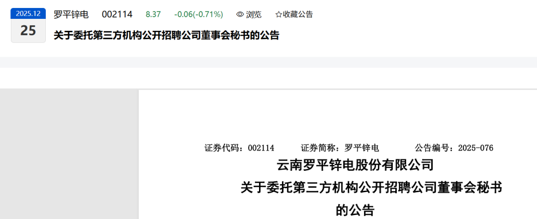 云南罗平锌电股份有限公司(以下简称 “公司”)于 2025 年 12 月 24 日召开第九届董事会第四次(临时)会议,审议通过了关于《委托第三方机构公开招聘公司董事会秘书》的议案,现将具体情况公告如下: