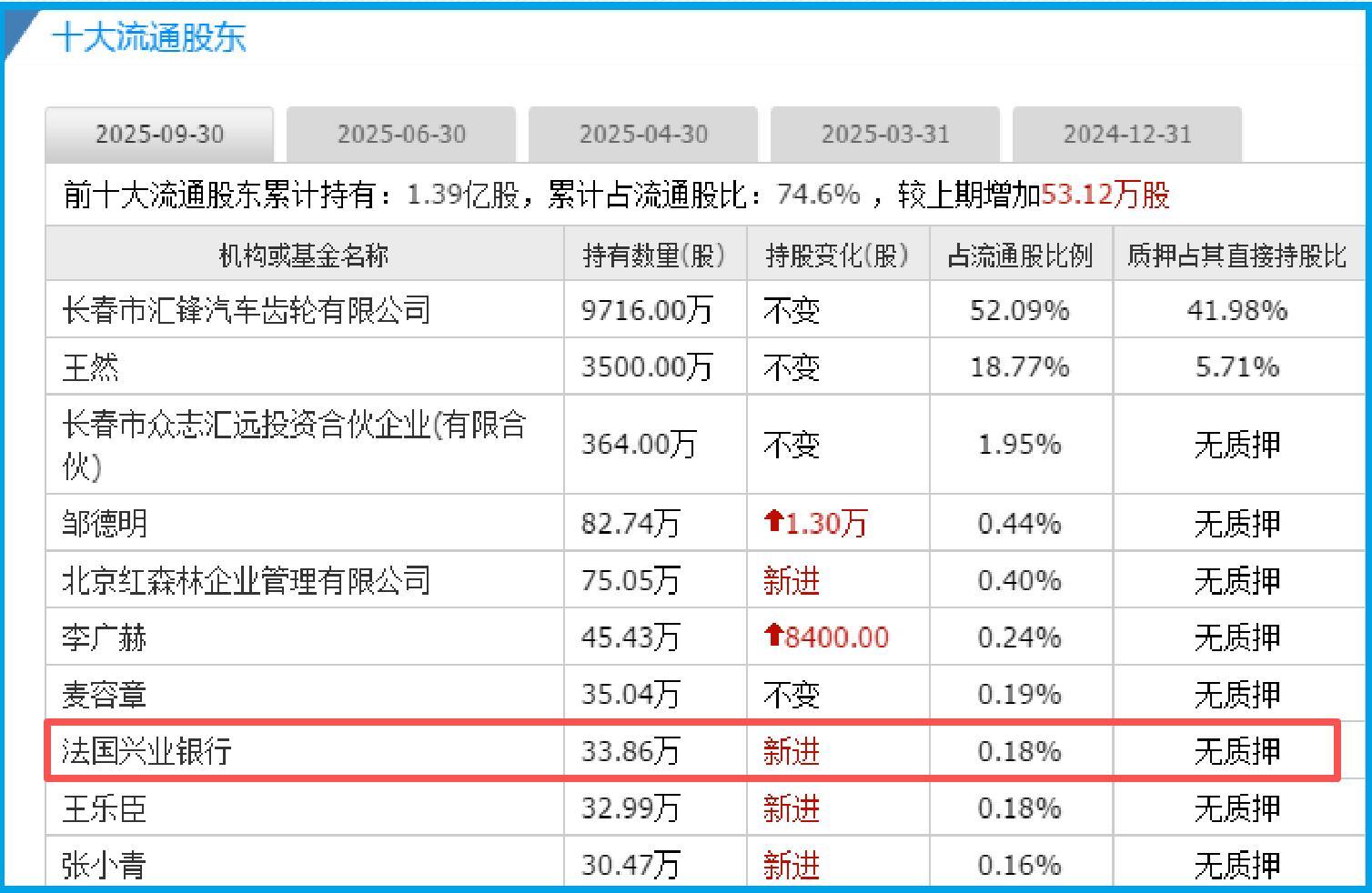 就在我们梳理财务线索时,一份“证人名单”吸引了目光:法国兴业银行出现在前十大流通股东之列。