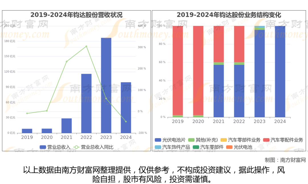 数据显示(如上图),钧达股份2024年营业收入为99.52亿,同比增长-46.66%,近5年复合年增长率84.52%。