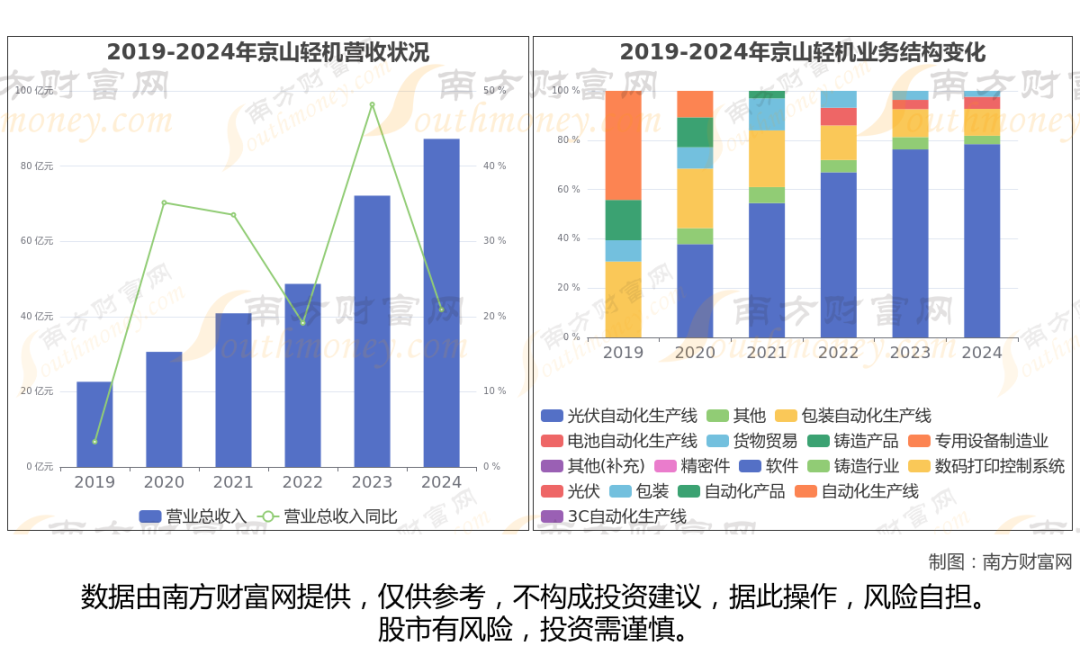 根据公司年度数据显示(如上图),2024年,京山轻机实现营业总收入87.23亿,同比增长20.92%,近5年复合年增长率29.94%。