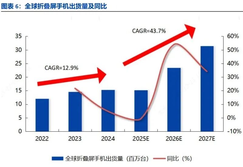 全球折叠屏手机出货量长期保持稳定增长态势。据 Omdia 与Canalys 的统计数据显示,全球折叠屏手机出货量从 2022 年的 1200 万台增长至2024 年的1530万台,2022-2024 年的复合增长率达到 12.9%;预计到 2027 年该品类出货量或将攀升至3140 万台,2025-2027 年的复合增长率可达 43.7%。
