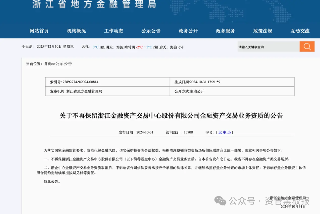 2024年10月:浙江证监局对俞发祥作出行政处罚,查明其指使祥源文旅虚构资产收购套取4.1亿元资金,用于旗下地产项目;同月,浙江省地方金融管理局公告,取消浙金中心金融资产交易业务资质,仅保留存量业务处理权限。(此时浙金中心已无合规交易资质,且祥源系资金问题已被监管盯上)