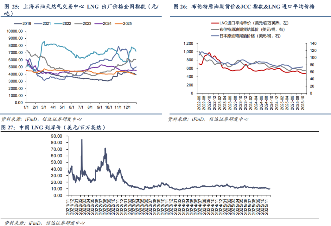 ● 国产LNG价格周环比下跌,进口LNG价格周环比上涨:截至12月25日,上海石油天然气交易中心LNG出厂价格全国指数为3937元/吨(约合2.81元/方),同比下降13.53%,环比下降3.39%;2025年11月,国内LNG进口平均价格为477.62美元/吨(约合2.42元/方),同比下降17.95%,环比下降0.60%。截至12月24日,中国进口LNG到岸价为9.79美元/百万英热(约合2.55元/方),同比下降33.01%,环比上升3.83%。