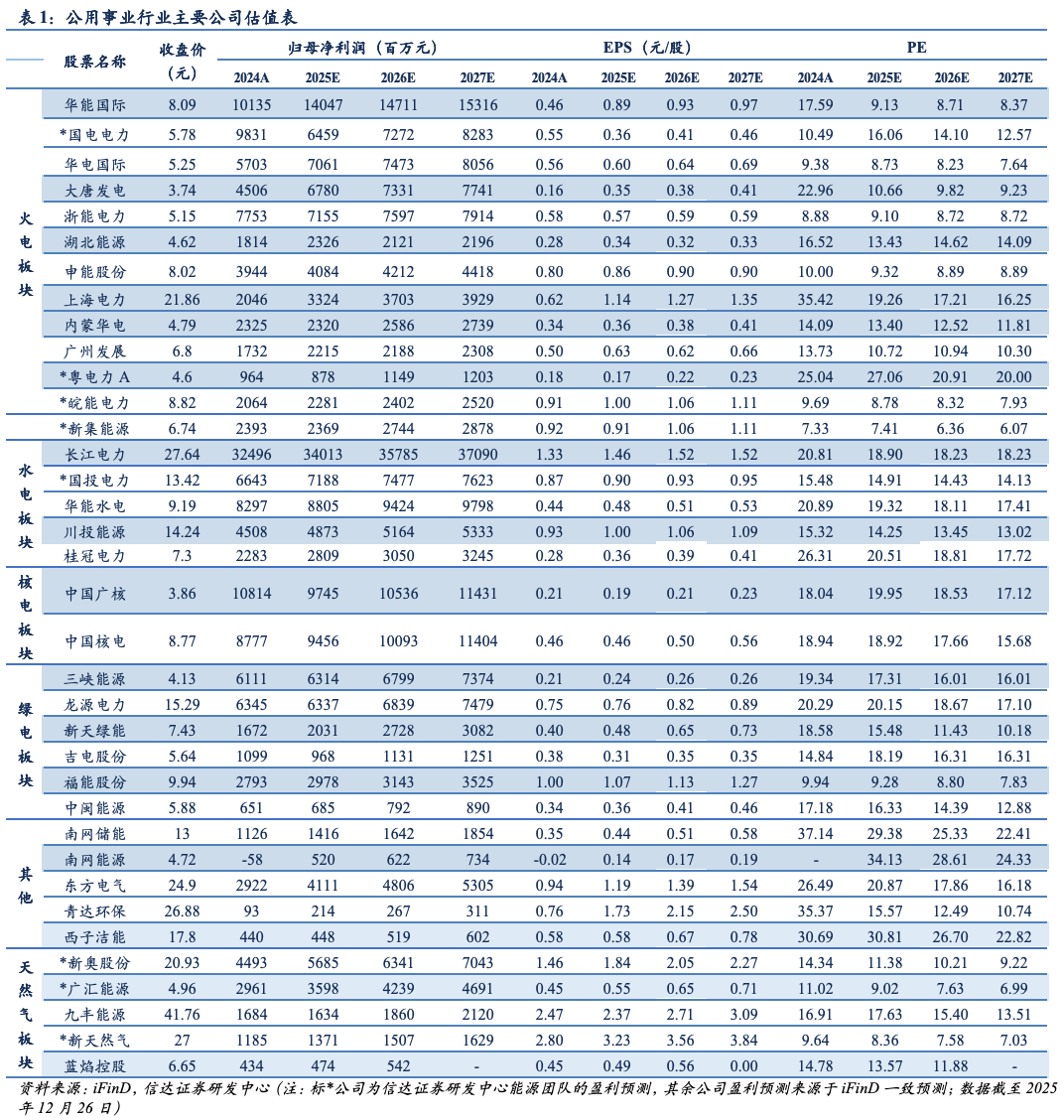 截至12月26日收盘,本周公用事业板块上涨0.8%,表现劣于大盘。其中,电力板块上涨0.65%,燃气板块上涨2.59%。