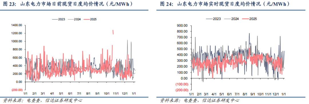 ● 山东实时现货市场:截至12月26日,山东电力实时现货市场的周度均价为225.96元/MWh,周环比下降8.22%,周同比下降8.2%。