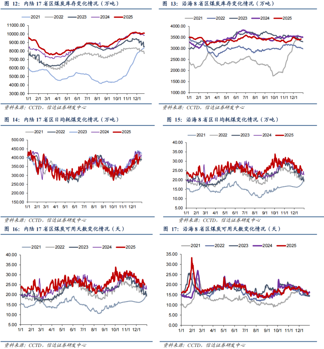 ● 沿海8省电厂库存、日耗及可用天数:截至12月25日,沿海8省煤炭库存3426.8万吨,较上周增加14.4万吨,周环比上升0.42%;沿海8省电厂日耗为215.7万吨,较上周增加11.3万吨/日,周环比上升5.53%;可用天数为15.9天,较上周下降0.8天。