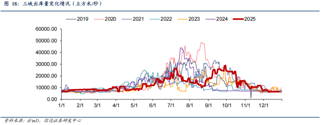 水电来水情况:三峡出库流量周环比增加。截至12月26日,三峡出库流量6540立方米/秒,同比下降6.57%,周环比上升0.15%。