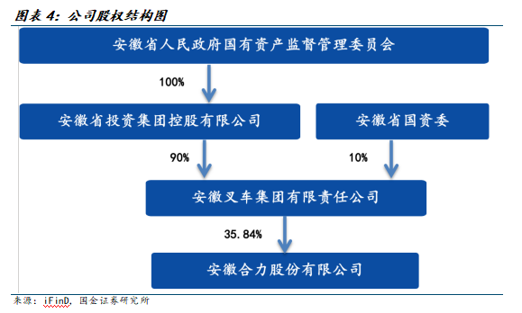 公司由安徽省国资控股控股,股权结构稳定。公司于1993年经安徽省批准,由安徽叉车集团有限责任公司独家发起,以合肥又车总厂的生产经营性资产出资,通过定向募集方式改制设立安徽合力,1996年公司挂牌上市。2022年6月,安徽省国资委将持有安徽叉车集团的90%国有股权划转至安徽投资集团控股有限公司,划转完成后,安徽省投资集团持有安徽叉车集团90%股权,安徽省国资委为公司实际控制人。