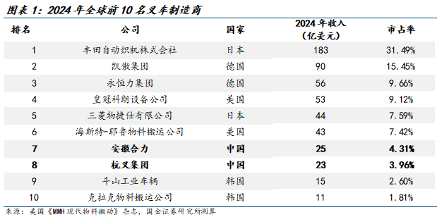 公司主营叉车业务、全球排名第七。公司始建于1958年,前身为合肥叉车总厂;主要从事工业车辆(叉车)、智慧物流产业及其关键零部件的研发、制造与销售。在国际叉车市场上,公司自2016年起连续多年在美国《现代物料搬运》杂志公布的全球叉车制造商排行榜中位列第7名;目前丰田自动织机株式会社、凯傲集团、永恒力集团等龙头企业占据叉车行业的主要市场份额,2024年三家市占率分别为31%/15%/10%。