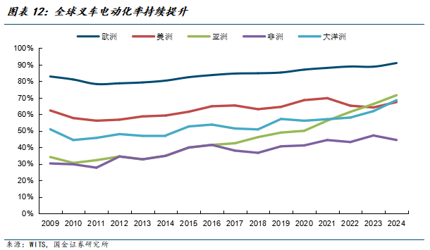 从产品结构看,电动叉车渗透率不断提升。随着全球各国对环境保护要求的不断提升,行业排放标准逐步升级,叉车的电动化占比结构也在持续优化。随着我国双碳”国家战略以及供给侧结构性改革的持续推进,我国叉车电动化率迅速提升,也带动亚洲叉车电动化持续提升。电动叉车产品附加值相对内燃叉车更高,毛利率水平较高;同时也是叉车智能化发展的基础,长期发展趋势确定性强。