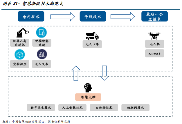具身智能技术加持,打开新一轮成长边界。依托AI、具身智能等前沿技术,物流行业物流正从“机械化作业”向“认知化智能”加速跃迁,无人叉车、具身机器人应运而生。随着国内外巨头纷纷下场推动具身机器人发展,物流行业凭借广阔的应用前景以及相对有限的动作规范和内容,有望成为具身智能机器人率先运用和落地的场景之一,价值潜力巨大。作为连接生产、流通和消费的关键纽带,智慧物流已成为支撑国民经济发展的基础性、战略性、先导性产业,发展前景广阔。