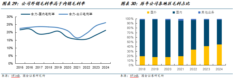 从盈利能力看,海外叉车市场盈利能力强。出口叉车产品相较于国内产品同等情况下配置略高、产品均价相对较高,且海外市场对标外资企业销售价格、因而竞争激烈程度低于国内市场,盈利能力相对较好。2024年安徽合力外销毛利率较内销高5pct。从毛利构成看,2024年公司出口业务毛利占比提升至45%。