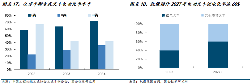 新能源锂电池叉车车型竞争力明显提升,叉车锂电化已成为全球趋势。电动叉车主要以铅酸电池或锂电池作为动力。过去电动叉车主要使用铅酸电池,铅酸叉车性价比相对油车不明显。相较于铅酸电池,锂电池具备质量更轻、体积更小、能量密度高的特征,充电速度更快,使用寿命更长,维护成本较低,绿色环保。随着锂电池技术以及高压锂电驱动技术的不断进步,高压锂电叉车的动力更足,逐渐在更多场景性能完全替代燃油叉车。高压锂电驱动技术进步有望带动锂电池替代铅酸电池的进程持续进行。根据中国工程机械工业协会工业车辆分会数据,2024年我国锂电池叉车总销量为44.88万台,占电动叉车比例达47.43%,在电动平衡重叉车中,锂电池叉车占比更是高达71.71%。全球叉车龙头凯傲集团预计2027年他们电动叉车锂电化率将提升60%。