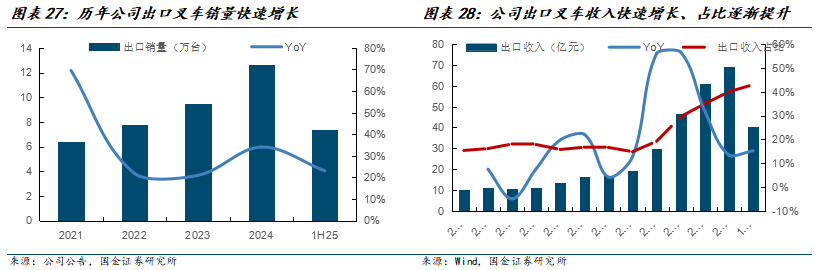 深化出海战略,全球竞争力提升。公司2014年以来持续加强海外中心以及营销服务网络建设,并凭借锂电叉车差异化产品全球竞争力不断提升。1H25,公司出口收入占比提升至43%,海外市场成贡献α增长潜力。