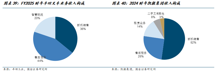 围绕叉车全生命周期及相关物流自动化的业务市场空间广阔。叉车后市场业务一般包括:配件与服务、经营租赁、融资租赁以及二手车翻新等,同时延伸出相关物流自动化相关业务,形成自动化全生命周期的所有业务。巨大的叉车保有量和相对稳定的叉车实际需求量为设备租赁、维修及整车与配件销售市场的繁荣奠定了坚实基础。全球龙头叉车公司后市场业务规模体量甚至高于叉车新机销售市场,丰田工业公司2025财年叉车业务中新机销售收入仅占36%,2024年凯傲集团新机销售收入占比仅占52%。