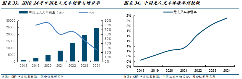 我国无人叉车市场规模快速增长,但渗透率仍然很低。2019-2024年销量复合增长率(CAGR)高达55%,显著高于传统叉车销量增速,成为物流装备领域增长最快的细分品类之一。2024年销量达2.45万台,同比增长26%,但渗透率仅约1.9%。2025年上半年,无人叉车销量同比增长266.7%,成为行业增长的新亮点。