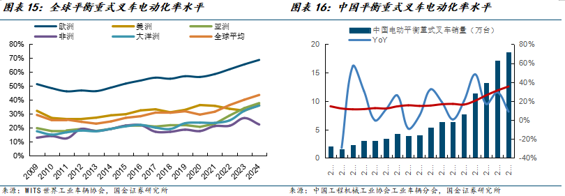 平衡重式叉车电动化率仍有巨大提升空间。剔除电动步行式仓储叉车(三类车),高附加值的叉车平衡重式叉车仍有提升空间,传统内燃平衡重式叉车的预期销量将逐步缩减。2024年欧洲平衡重式叉车电动化率提升至68%,而中国仅35%,低于全球平均水平43%,发展潜力巨大。