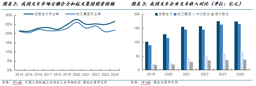 公司是国内叉车行业领军企业,收入和销量连续多年排名全国第一。国内叉车行业呈现“双寡头”引领的格局。我国叉车行业内主要企业包括安徽合力、杭叉集团、中力股份、诺力股份、比亚迪、龙工叉车等,安徽合力和杭叉集团形成双寡头垄断局面,根据中国工程机械工业协会工业车辆分会,2024年合计销量市占率约45.7%。从细分产品来看,内燃叉车与电动叉车领域市场竞争格局具有一定差异:在内燃叉车市场,以安徽合力、杭叉集团等为代表的企业占据了主导地位,而在电动叉车和新能源叉车领域,除了安徽合力和杭叉集团外,韶关比亚迪、中力股份、林德叉车具有一定优势。