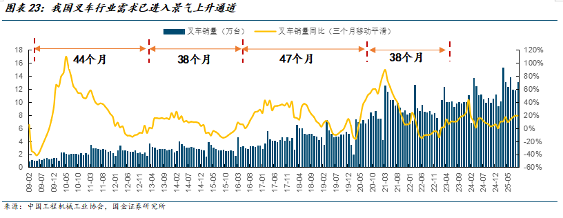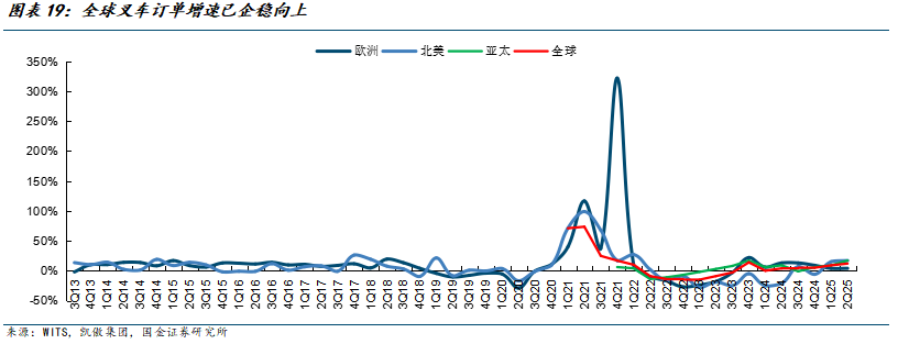 叉车作为弱周期行业,在经历约2年下行期后,2025年以来全球订单量显著增长。尤其是北美,从1Q25开始,叉车订单增速结束长达10个季度的下行。欧洲订单增速率先走出下行期,亚太订单增速总体表现较强的仍需。2Q25,欧洲、北美、亚太地区、全球合计叉车订单增速分别达2%、17%、17%、12%。全球降息周期下,低利率环境降低了企业融资成本,有望刺激制造业设备投资和物流自动化升级。